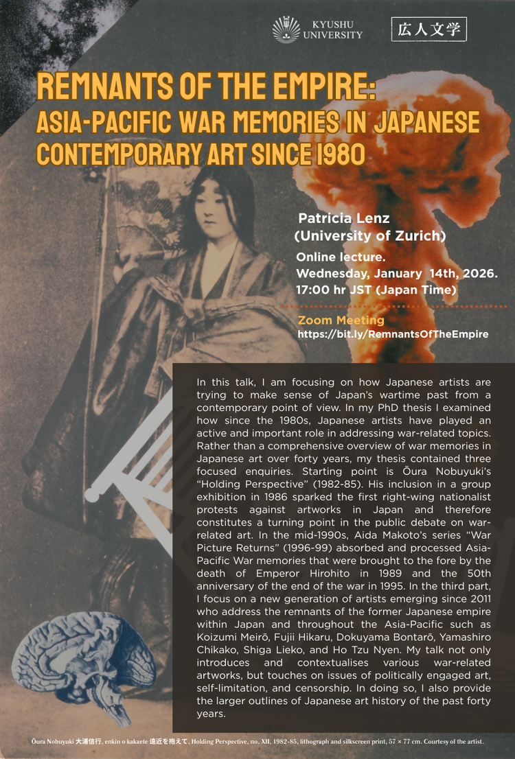This talk focuses on how Japanese artists are trying to make sense of Japan’s wartime past from a contemporary point of view. In my PhD thesis I examined how since the 1980s, Japanese artists have played an active and important role in addressing war-related topics. Rather than a comprehensive overview of war memories in Japanese art over forty years, my thesis contained three focused enquiries. Starting point is Ōura Nobuyuki’s “Holding Perspective” (1982-85). His inclusion in a group exhibition in 1986 sparked the first right-wing nationalist protests against artworks in Japan and therefore constitutes a turning point in the public debate on war-related art. In the mid-1990s, Aida Makoto’s series “War Picture Returns” (1996-99) absorbed and processed Asia-Pacific War memories that were brought to the fore by the death of Emperor Hirohito in 1989 and the 50th anniversary of the end of the war in 1995. In the third part, I focus on a new generation of artists emerging since 2011 who address the remnants of the former Japanese empire within Japan and throughout the Asia-Pacific such as Koizumi Meirō, Fujii Hikaru, Dokuyama Bontarō, Yamashiro Chikako, Shiga Lieko, and Ho Tzu Nyen. My talk not only introduces and contextualises various war-related artworks, but touches on issues of politically engaged art, self-limitation, and censorship. In doing so, I also provide the larger outlines of Japanese art history of the past forty years.