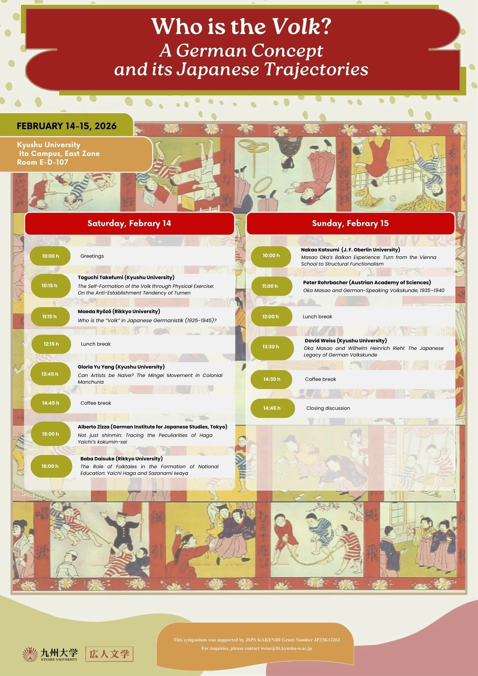 The aim of this symposium is to gain a deeper understanding of the concept of Volk and its Japanese trajectories by bringing together case studies from a range of disciplines, including (German and Japanese) literary studies, art history, intellectual history, ethnology, and folklore studies. It is hoped that this multidisciplinary approach will yield new insights into the transfer of knowledge between the German-speaking countries and Japan during the late nineteenth and early twentieth centuries.