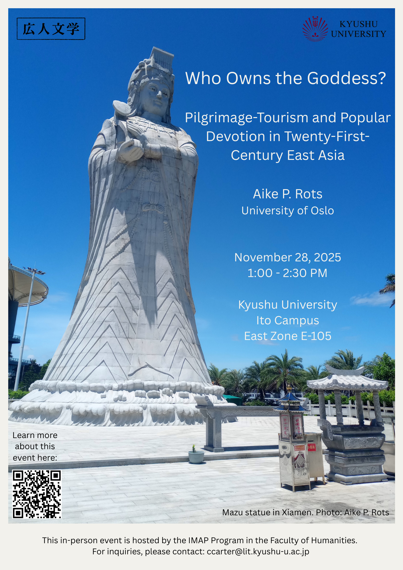 This presentation has an exploratory character and a comparative transnational focus, drawing on fieldwork experiences from Vietnam, Taiwan, China, and Japan. It raises the question: why is it that, in this so-called secular age, goddess worship continues to be popular across East Asia? Why are historic pilgrimage sites such as Putuoshan in China or Enoshima in Japan among the most-visited tourist destinations in the region today? What new forms of devotional practice are emerging, and how do they relate to societal, economic, and environmental changes?